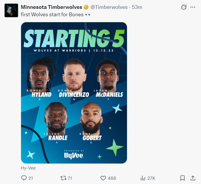 森林狼:麦丹17分5篮板,兰德尔27分9篮板6助攻,戈贝尔24分14篮板,迪温琴佐21分6篮板,里德18分7篮板。