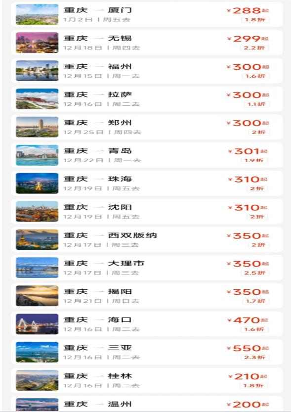 除此之外,北海、珠海、广州、厦门等地也适合在冬季慢节奏游览。重庆至北海每日约2班,单程最低仅需320元起,至珠海每日约6班,最低310元起,至广州每日约23班,仅259元起,至福州、厦门每日约14班,最低300元起。